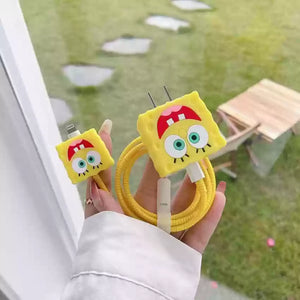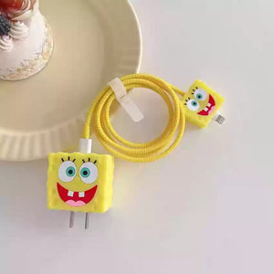 Iphone Charger Case Cover - Yellow SpongeBob - 4 Piece Set (With Wire Protector)